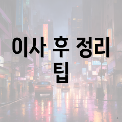 정리 후의 태도: 이사 후에는 새로운 환경에 빠르게 적응하는 것도 중요해요. 이사를 마친 뒤 정리하는 팁으로는 먼저 꼭 필요한 물건을 정리한 후, 나머지는 시간이 허락하는 대로 차근차근 정리해나가는 것이에요. 이사를 간 첫날부터 모든 것을 정리하려고 하면 오히려 더 스트레스를 받을 수 있으니, 단계적으로 접근하세요.